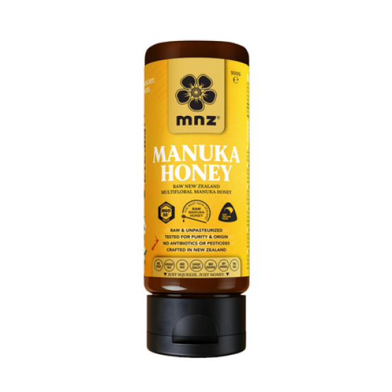 MGO 50+ (500gr) knijpfles van MNZ (Manuka New Zealand) is een rauwe, ongefilterde en ongepasteuriseerde multiflorale Manuka honing met volledige herkomst uit Nieuw-Zeeland, verpakt in een gebruiksvriendelijke doseerfles voor dagelijks gemak.