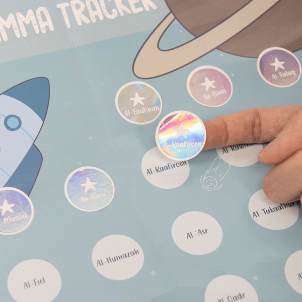 Ontdek de Djoez โAmma Tracker! De perfecte motivatie bij het memoriseren van het laatste deel van de Koran. Deze mooie kleurrijke A3-poster is ontworpen om de voortgang van je kind bij te houden en hen extra te motiveren. Met 38 glitter stickers wordt elke stap in het memoriseren gevierd. Maak Koran leren leuk, vers na vers!