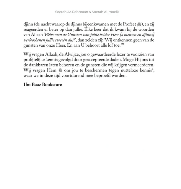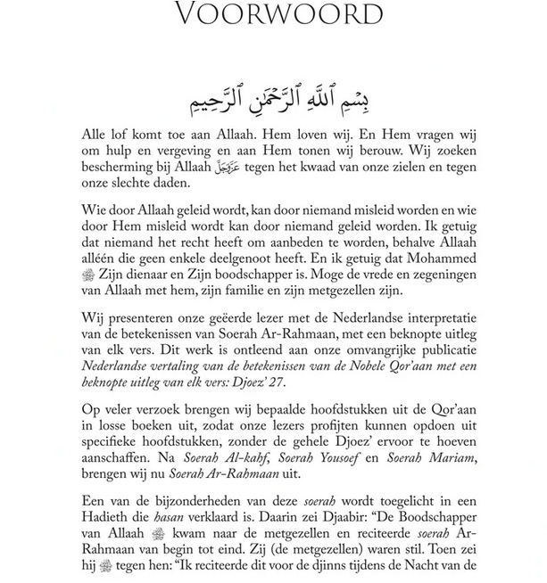Dit boek is ontleend aan onze populaire reeks Nederlandse vertaling van de betekenissen van de Nobele Qorโaan met een beknopte uitleg van elk vers. Soerah Ar-Rahmaan komt uit Djoezโ 27 en soerah Al-moelk uit Djoezโ29.